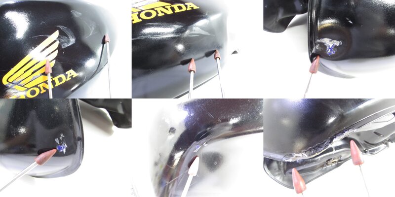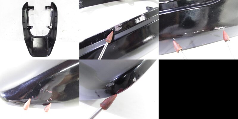 【外装】 ☆タンク・・・特に大きな破損は御座いません! タンク内見える範囲に少し錆が御座いますので燃料フィルターのご使用、または洗浄補修後のご使用をお勧めいたします! 一部傷や凹み、塗装剥げなど御座います! ☆Fフェンダー・・・特に大きな破損は御座いません! 一部傷やひび割れ、塗装剥げや補修箇所が御座います! ☆サイドカバー・・・左右共に特に気になるような破損は御座いません! 一部軽い傷やネジ止め部に軽度のひび割れが御座います! ☆テールカウル・・・特に気になるような破損は御座いません! 一部傷や塗装剝げが御座います! ☆シート・・・程度良好!! 純正カスタムのタックロールシートになります! 特に気になるようなレザーの破れやベースの破損は御座いません! 商品状態良好です!