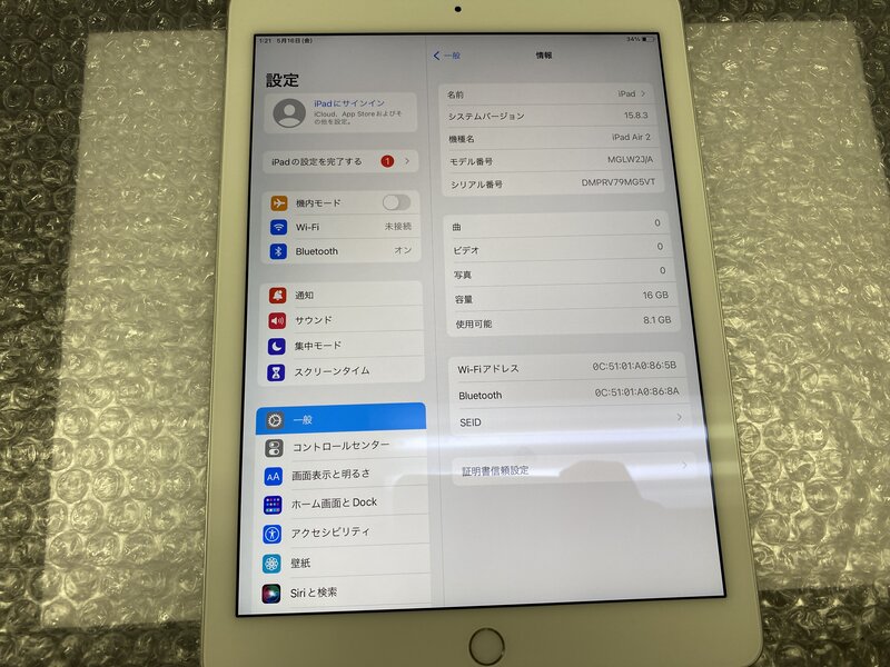 NW348 iPad Air 第2世代 Wi-Fiモデル A1566 シルバー 16GB