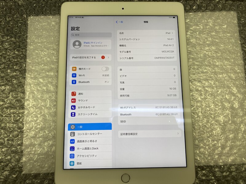 NW353 iPad Air 第2世代 Wi-Fiモデル A1566 シルバー 16GB