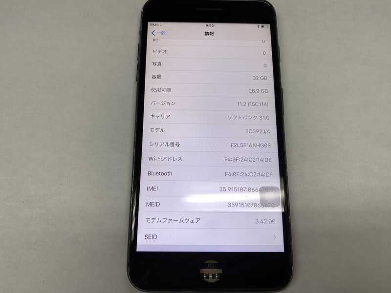アクティベーションロック・・・OFF ホームボタン欠損・ホームボタン不可・TouchID不可・デモ機のためSIMロック解除不可 バッテリー最大容量:93%