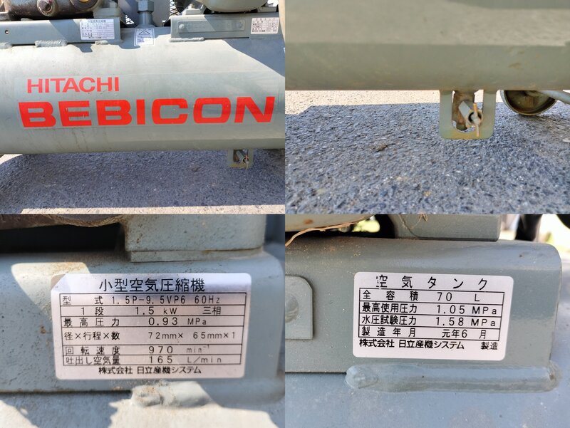 日立 エアーコンプレッサー エアコンプレッサー 高圧 1.5P-9.5VP6 60Hz タンク容量 70L 三相 200V 通電確認OK 中古 滋賀県
