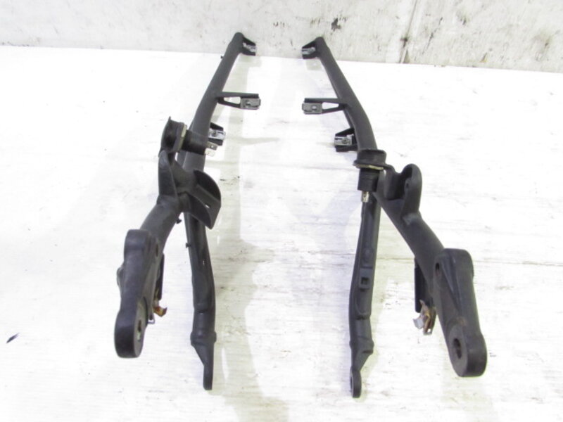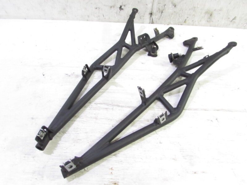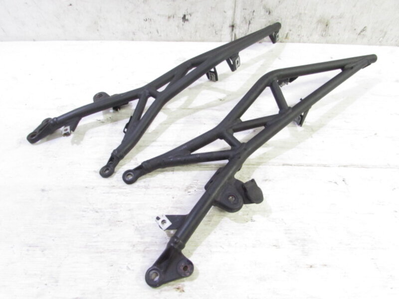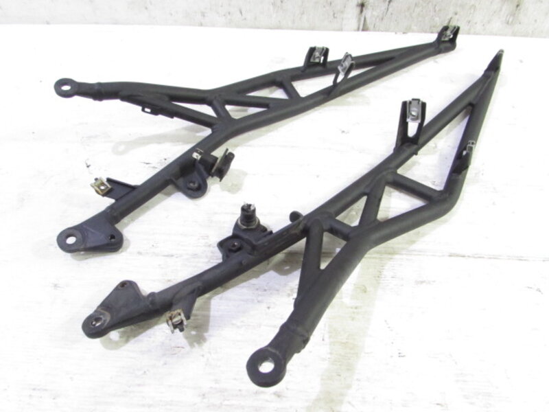 【足回り】 ☆フロントフォーク・・・オーリンズ製の電気制御式 倒立フロントフォークになります! 外観特に気になるような破損は御座いません!取り外し前に数回ボトムをさせてみましたところOIL滲みが見られました! ダストブーツにひび割れが出てきております!ボトムケースに一部傷、先端のカプラ部のプラに欠けが御座います! オクムラさんのステッカーが貼られておりますのでオクムラにて過去にOHされているようです! 片方のボトムケースに曲りが御座います! 補修ベースにご活用ください! ☆スイングアーム・・・目視にて曲がりもなく、外観特に気になるような破損は御座いません!シャフトなどのSETとなります! リアサスペンションを固定しているボルトの頭がなめっており取り外し出来ませんでしたのでオーリンズ製リアサスペンションをSETしております!一部傷が御座います! ☆リアサスペンション・・・オーリンズ製のTTX 電子制御式のリアサスペンションになります! 目視で曲がりも無く、外観特に気になるような破損は御座いません! なかなか綺麗に保たれた商品となります! スイングアームに付属しておりますのでスイングアームとSETになります! ☆Fホイール・・・リムに大きなゆがみや傷が御座います! 補修ベースなどにご活用ください! ☆Rホイール・・・程度良好!! 目視にて曲りもなく、外観特に気になるような破損も御座いません! 商品状態良好です! ☆タイヤ・・・前後共に実働車より取り外しており、特に気になるような目立ったひび割れは見られず残り溝も御座います!