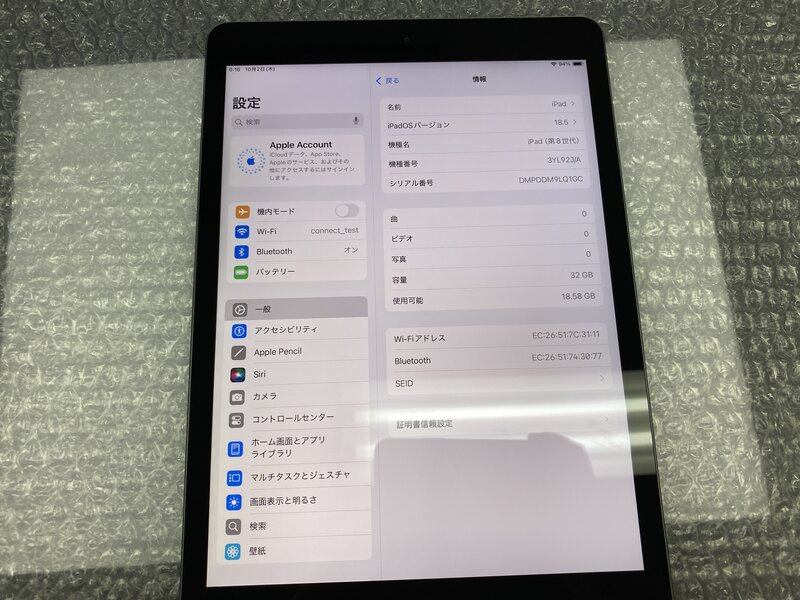 EL842 iPad 第8世代 Wi-Fiモデル A2270 スペースグレイ 32GB