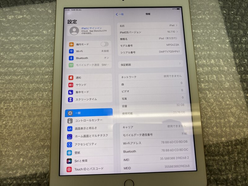 EM304 SIMフリー iPad 第5世代 Wi-Fi+Cellular A1823 ゴールド 32GB