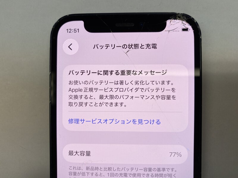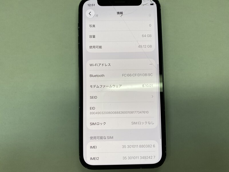 アクティベーションロック・・・OFF 画面割れ・カメラ警告・アウトカメラ不良(0.5倍レンズ切り替え不可)・Wi-Fi不可・Bluetooth不可