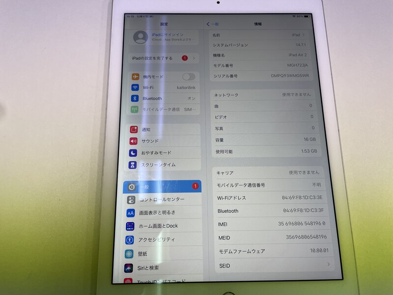 MI545 docomo iPad Air2 Wi-Fi+Cellular A1567 16GB シルバー 判定〇