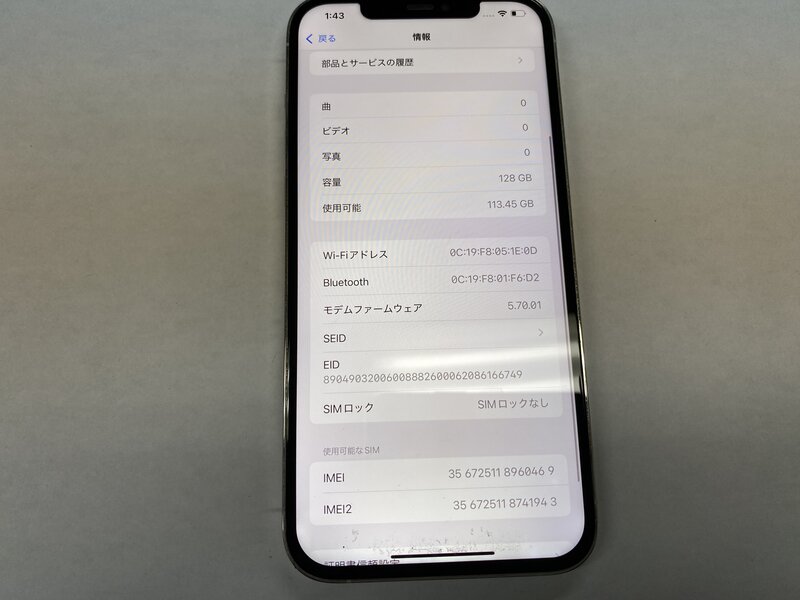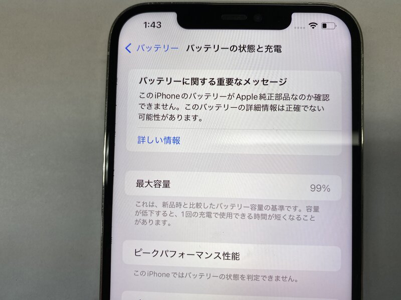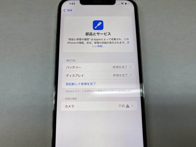 アクティベーションロック・・・OFF ディスプレイ警告・バッテリー交換品・カメラ警告・アウトカメラ不良(0.5倍レンズ切り替え不可)・インカメラ曇り