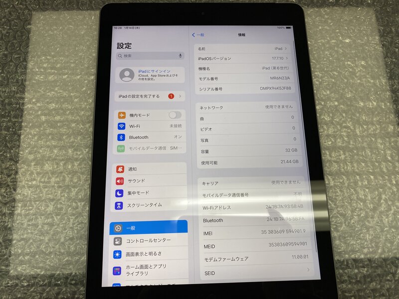 アクティベーションロック・・・OFF バッテリー劣化(バッテリー最大容量:14%)