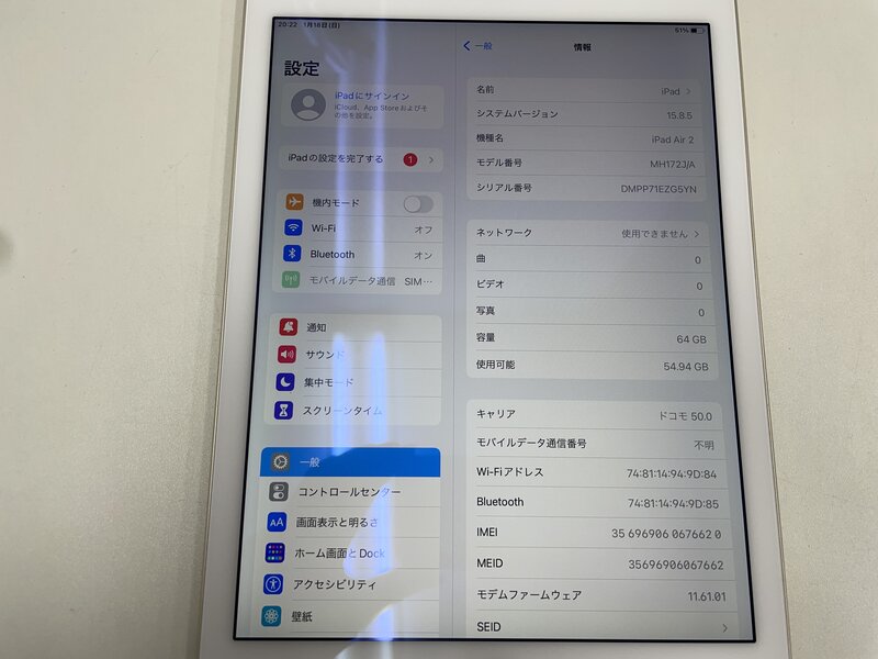 MJ066 docomo iPad Air2 Wi-Fi+Cellular A1567 64GB ゴールド 判定〇