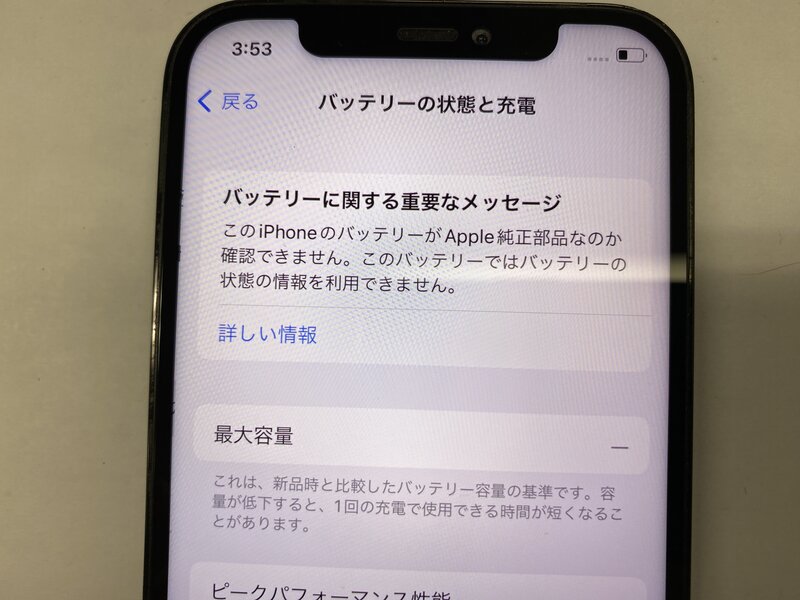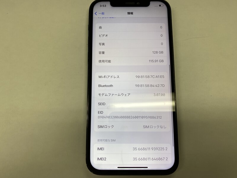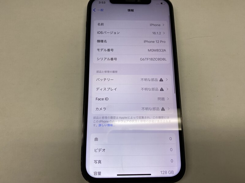 アクティベーションロック・・・OFF 背面割れ・ディスプレイ警告・バッテリー交換品・カメラ警告・アウトカメラ不良(0.5倍レンズピントが合わない)・FaceID不可