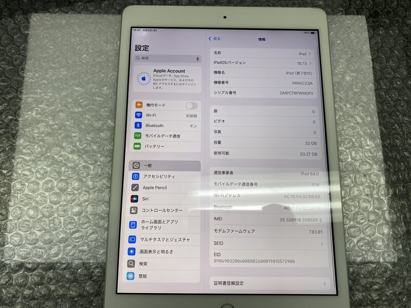 OB783 SIMフリー iPad 第7世代 Wi-Fi+Cellular A2198 シルバー 32GB